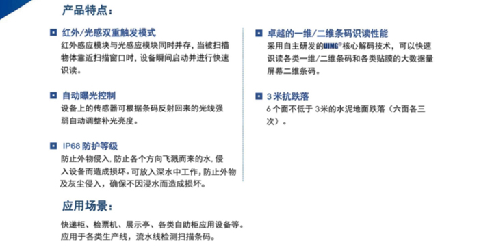 采用自主研發(fā)的UIMG核心解碼技術(shù),可快速識(shí)讀各類一維/二維條碼和各類貼膜的大數(shù)據(jù)量屏幕二維條碼。